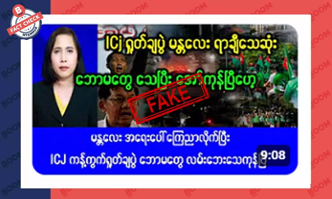 အဆိုပါ သတင်းအတုကို YouTube ချန်နယ်တစ်ခုက ဇန်နဝါရီလ ၂၆ ရက်နေ့မှာ ဖြန့်ထားတာ ဖြစ်ပြီး သတင်းအမှားကို ဖြန့်ဝေရာမှာ ၉ မိနစ်ကျော် ကြာမြင့်တဲ့ Video တစ်ပုဒ်နဲ့ တွဲတင်ထားတာ ဖြစ်ပါတယ်။ ဒီ Video ရဲ့ နောက်ခံမှာ စစ်ခေါင်းဆောင် မင်းအောင်လှိုင်နဲ့ မဘသ အဖွဲ့တွေ ပါဝင်တဲ့ ဓါတ်ပုံတွေရယ်၊ သတင်းကြေညာသူ တစ်ဦး ပါဝင်တဲ့ ဓါတ်ပုံတွေကို ဖော်ပြထားပြီး ဓါတ်ပုံပေါ်မှာ “ICJ ရှုတ်ချပွဲ မန္တလေး ရာချီသေဆုံး၊ ဘောမတွေ သေပြီး အော်ကုန်ပြီဟေ့။ မန္တလေး အရေးပေါ် ကြေညာလိုက်ပြီး Icj ကန့်ကွက်ရှုတ်ချပွဲ ဘောမတွေ လမ်းဘေးမှာ သေကုန်ပြီ” (မူရင်း ရေးသားထားသည့်အတိုင်း) လို့ ရေးသားထားပါတယ်။