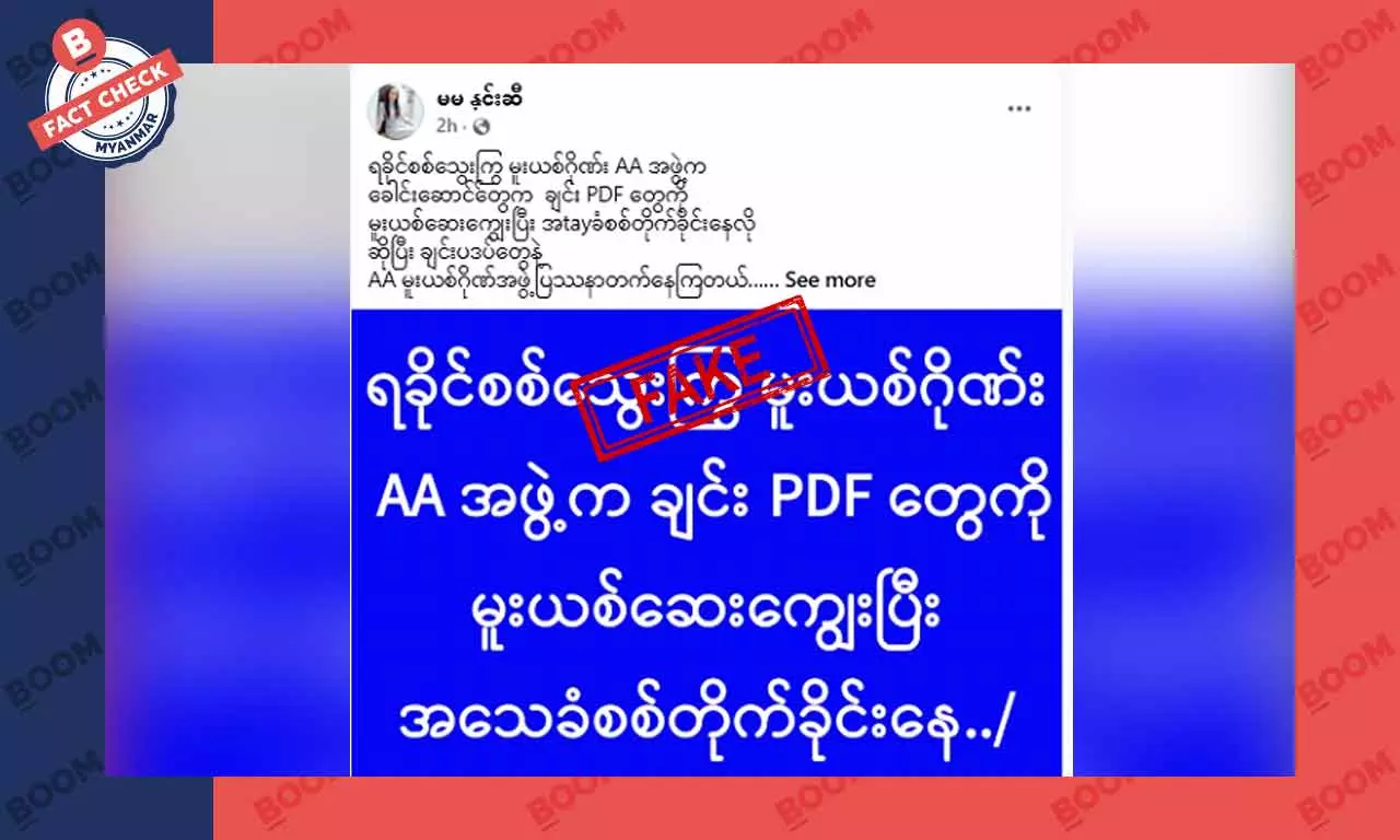 AA အဖွဲ့ခေါင်းဆောင်တွေက ချင်း PDF တွေကို မူးယစ်ဆေး ကြွေးပြီး အသေခံ တိုက်ခိုင်းနေတယ်ဆိုတဲ့ အကြောင်းအရာကို Boom Myanmar က အချက်အလက် စစ်ဆေးကြည့်တဲ့အခါ လုပ်ကြံရေးသားထားတဲ့ ဝါဒဖြန့် သတင်းအတုဖြစ်တာကို တွေ့ရပါတယ်။