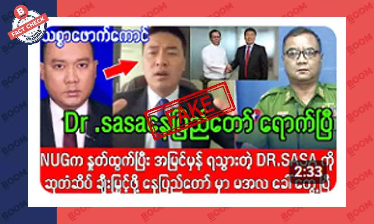 ဒေါက်တာဆာဆာဟာ NUG က နုတ်ထွက်ပေမယ့် နေပြည်တော်ကို ရောက်ရှိနေခြင်း စစ်ကောင်စီနဲ့ တွေ့နေခြင်း မရှိပါဘူး။ ဒီအကြောင်းအရာဟာ သတင်းအမှား ဖြန့်သူတွေက လုပ်ကြံ ရေးသားထားခြင်းသာ ဖြစ်ပါတယ်။