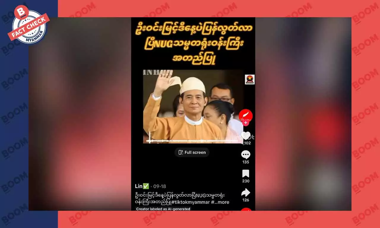 အဆိုပါ သတင်းအတုကို TikTok အကောင့်တစ်ခုက ဖြန့်ထားတာ ဖြစ်ပြီး သတင်းအမှားကို ဖြန့်ဝေရာမှာ ၂ မိနစ်ကျော် ကြာမြင့်တဲ့ Video တစ်ပုဒ်နဲ့ တွဲတင်ထားတာ ဖြစ်ပါတယ်။ ဒီ Video ရဲ့ နောက်ခံမှာ စစ်ကောင်စီက မတရားဖမ်းဆီးထားတဲ့ သမ္မတဟောင်း ဦးဝင်းမြင့်ရဲ့ ဓါတ်ပုံတွေကို သုံးထားပြီး Video ပေါ်မှာ “ဦးဝင်းမြင့် ဒီနေ့ပဲ ပြန်လွတ်လာပြီ။ NUG သမ္မတရုံးဝန်ကြီး အတည်ပြုပြီ” (မူရင်း ရေးသားထားသည့်အတိုင်း) လို့ ရေးသားထားပါတယ်။