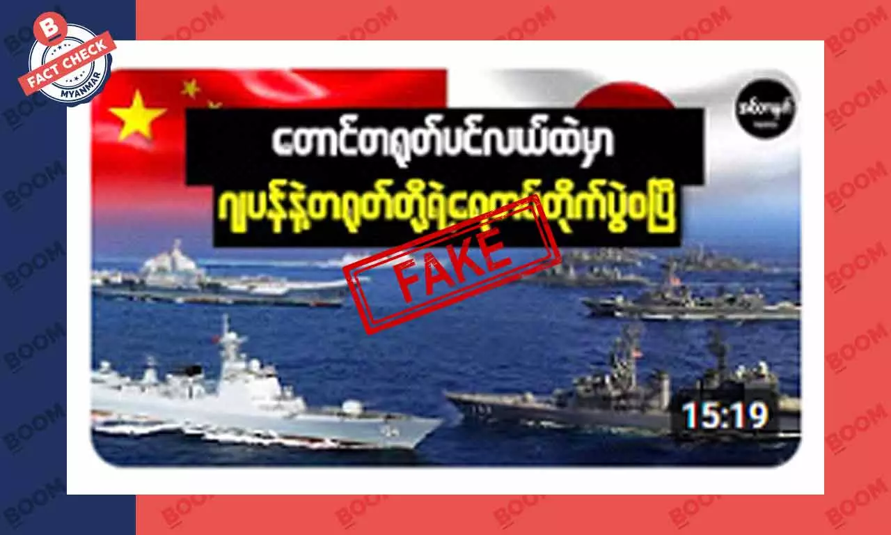 တောင်တရုတ်ပင်လယ်မှာ ဂျပန်နဲ့ တရုတ်တို့ရဲ့ ရေတပ်တိုက်ပွဲ စပြီ ဆိုတဲ့ အကြောင်းအရာကို Boom Myanmar က အချက်အလက် စစ်ဆေးကြည့်တဲ့အခါ ဝင်ရောက်ကြည့်ရှုသူ များအောင် လုပ်ကြံရေးသားထားတဲ့ သတင်းအတုဖြစ်တာကို တွေ့ရပါတယ်။