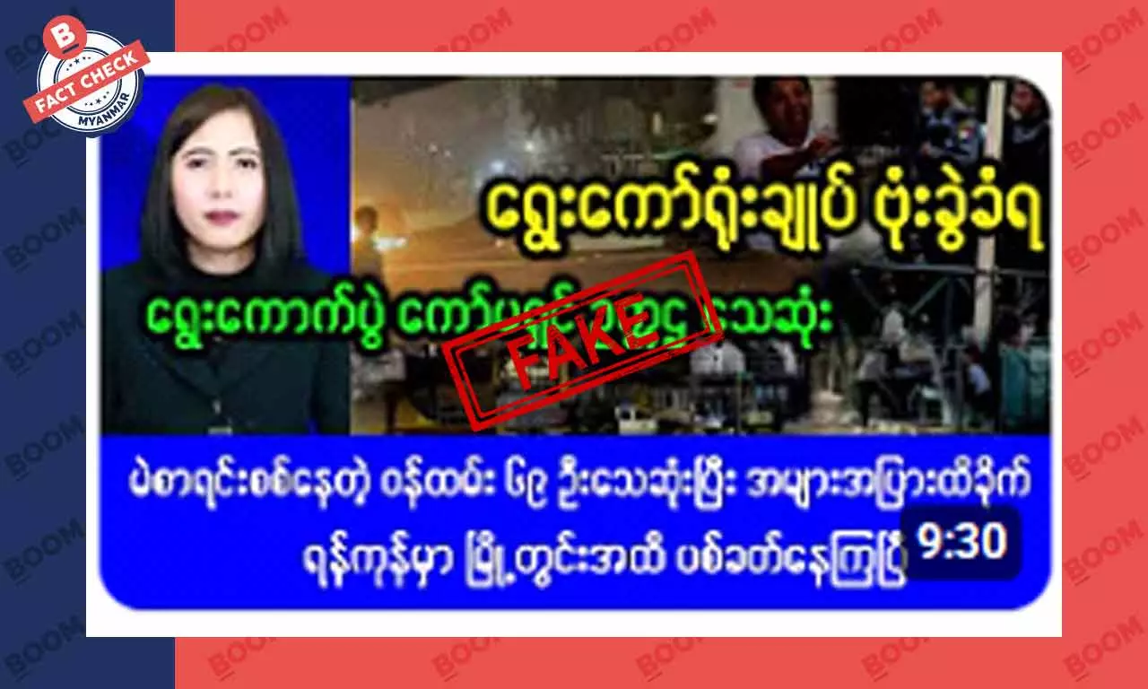 အဆိုပါ သတင်းအတုကို YouTube ချန်နယ်တစ်ခုက ဒီဇင်ဘာလ ၂၈ ရက်နေ့မှာ ဖြန့်ထားတာ ဖြစ်ပြီး သတင်းအမှားကို ဖြန့်ဝေရာမှာ ၉ မိနစ်ခန့် ကြာမြင့်တဲ့ Video တစ်ပုဒ်နဲ့ တွဲတင်ထားတာ ဖြစ်ပါတယ်။ ဒီ Video ရဲ့ နောက်ခံမှာ Photoshop နဲ့ ပြုပြင်ထားတဲ့ ဓါတ်ပုံတစ်ပုံရယ်၊ သတင်းကြေညာသူ တစ်ဦး ပါဝင်တဲ့ ဓါတ်ပုံတွေကို ဖော်ပြထားပြီး ဓါတ်ပုံပေါ်မှာ “ရွေးကော်ရုံးချုပ် ဗုံးခွဲခံရ။ ရွေးကောက်ပွဲ ကော်မရှင် ဥက္ကဌ သေဆုံး။ မဲစာရင်း စစ်နေတဲ့ ဝန်ထမ်း ၆၉ ဦး သေဆုံးပြီး အများအပြား ထိခိုက် ရန်ကုန်မှာ မြို့တွင်အထိ ပစ်ခတ်နေကြပြီ” (မူရင်း ရေးသားထားသည့်အတိုင်း) လို့ ရေးသားထားပါတယ်။