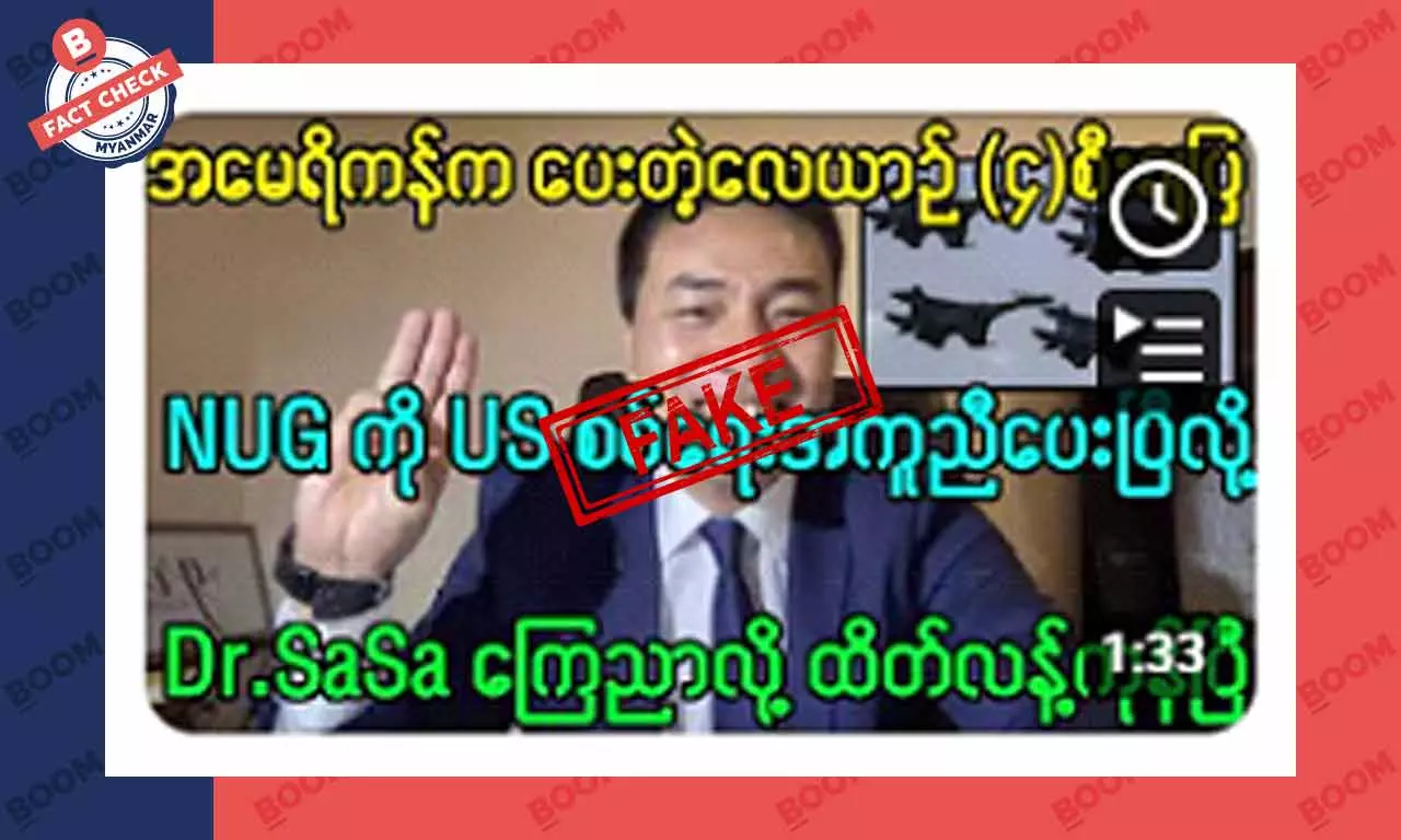 အဆိုပါ သတင်းအတုကိုYouTube ချန်နယ်တစ်ခုက အောက်တိုဘာလ ၁၅ ရက်နေ့မှာ ဖြန့်ထားတာ ဖြစ်ပြီး သတင်းအမှားကို ဖြန့်ဝေရာမှာ ၁ မိနစ်ကျော် ကြာမြင့်တဲ့ Video တစ်ပုဒ်နဲ့ တွဲတင်ထားတာ ဖြစ်ပါတယ်။ ဒီ Video ရဲ့ နောက်ခံမှာ NUG ဝန်ကြီး ဒေါက်တာဆာဆာရဲ့ ဓါတ်ပုံကို အသုံးပြုထားပြီး ဓါတ်ပုံပေါ်မှာ “အမေရိကန်က ပေးတဲ့ လေယာဉ် ၄ စီး ချပြ။ NUG ကို US စစ်ရေးအကူအညီပေးပြီလို့ Dr Sa Sa ကြေညာလို့ ထိတ်လန့်ကုန်ပြီ” (မူရင်း ရေးသားထားသည့်အတိုင်း) လို့ ရေးသားထားပါတယ်။