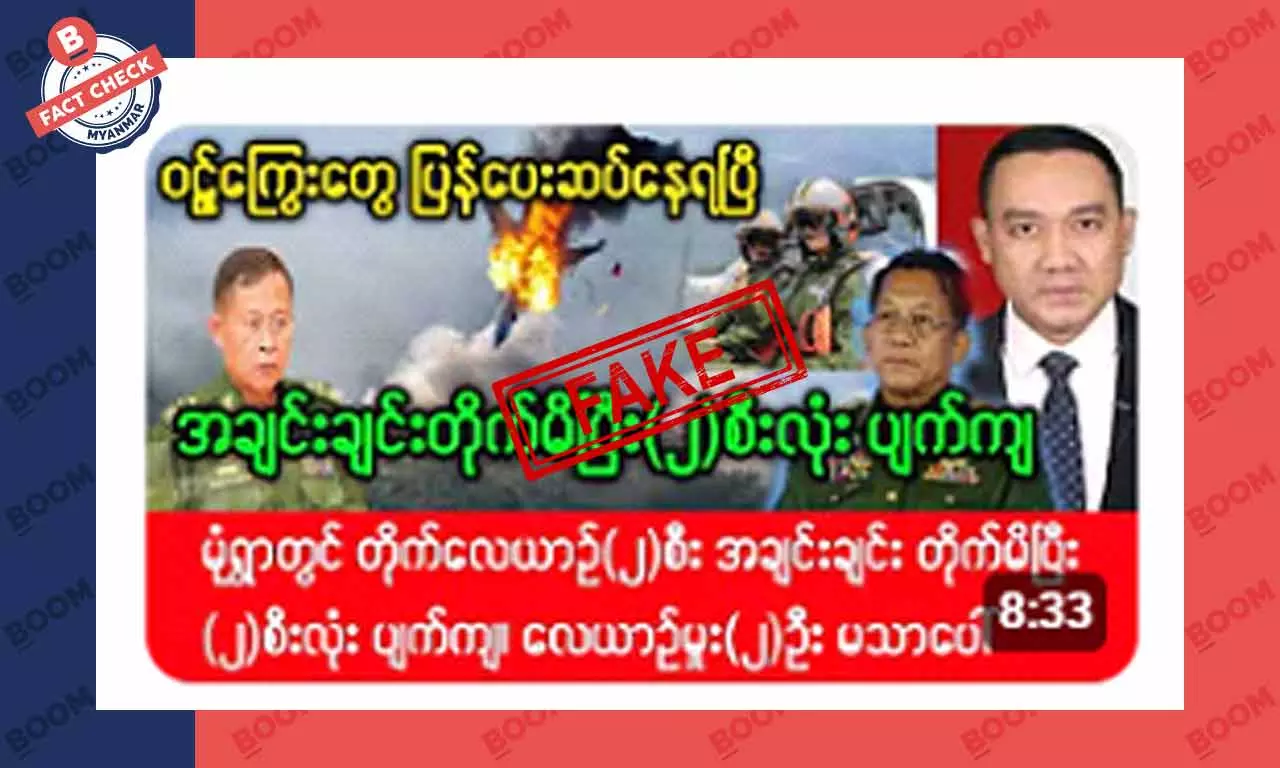 ဒီရက်ပိုင်း အတွင်းမှာ စစ်ကောင်စီလေယာဉ် ၂ စီး အချင်းချင်းတိုက်မိပြီး ပျက်ကျတယ်ဆိုတဲ့ ဖြစ်စဉ်မရှိပါဘူး။ ဒီအကြောင်းအရာဟာ သတင်းအမှား ဖြန့်သူတွေက လုပ်ကြံ ရေးသားထားခြင်းသာ ဖြစ်ပါတယ်။