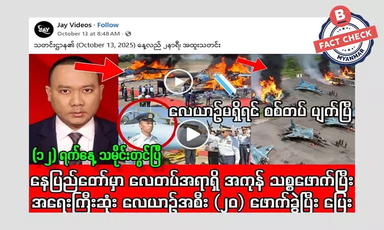 စစ်တပ်လေယာဉ်အစီး ၂၀ ဖောက်ခွဲခံရတယ်ဆိုတဲ့ အကြောင်းအရာကို Boom Myanmar က အချက် အလက် စစ်ဆေး ကြည့်တဲ့အခါ လုပ်ကြံဖန်တီးထားတဲ့ သတင်းအတု ဖြစ်တာကို တွေ့ရပါတယ်။ ဖြန့်ဝေထားတဲ့ ဗီဒီယိုထဲမှာ AI နည်းပညာနဲ့ ဖန်တီးပြုပြင်ထားတဲ့ လေယာဉ်မီးလောက်နေတဲ့ ပုံတွေကို အသုံးပြုပြီး နေပြည်တော်မှာ စစ်ကောင်စီ လေတပ်အရာရှိတွေက လေယာဉ်အစီး ၂၀ ဖောက်ခွဲ ထွက်ပြေးတယ်ဆိုပြီး နောက်ခံစကားပြောနဲ့ ပြောဆိုနေတာပါ။