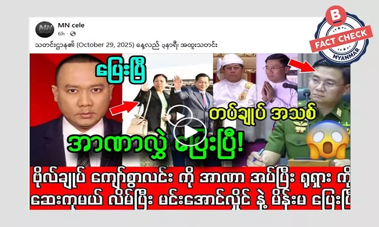 စစ်ခေါင်းဆောင် ဗိုလ်ချုပ်ကျော်စွာလင်းကို အာဏာလွှဲပြီး ရုရှားပြေးတယ်ဆိုတဲ့ အကြောင်းအရာကို Boom Myanmar က အချက် အလက် စစ်ဆေး ကြည့်တဲ့အခါ လုပ်ကြံဖန်တီးထားတဲ့ သတင်းအတု ဖြစ်တာကို တွေ့ရပါတယ်။