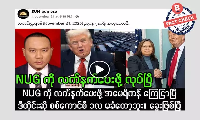 NUG ကို လက်နက်ထောက်ပံ့ဖို့ အမေရိကန် ကြေညာတယ်ဆိုတဲ့ အကြောင်းအရာကို Boom Myanmar က အချက် အလက် စစ်ဆေး ကြည့်တဲ့အခါ လုပ်ကြံဖန်တီးထားတဲ့ သတင်းအတု ဖြစ်တာကို တွေ့ရပါတယ်။