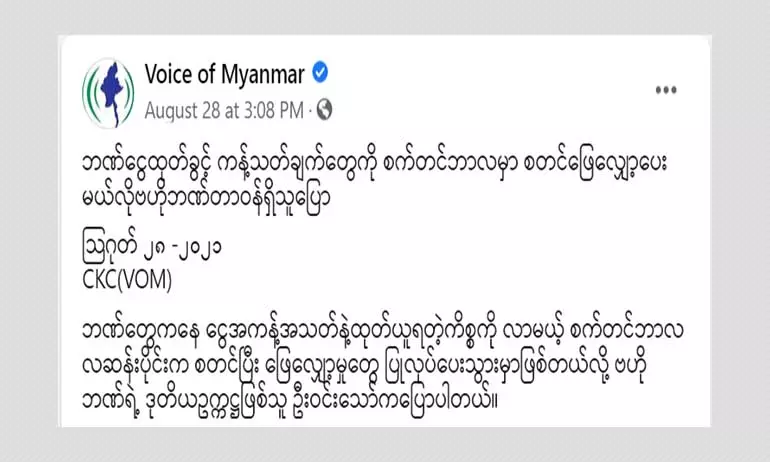 Voice of Myanmar (VOM) သတင်းဌာနမှာ သြဂုတ်လ ၂၈ ရက်နေ့က ဖော်ပြထားတဲ့ သတင်းကို ဒီနေရာ မှာ ဝင်ရောက်ကြည့်ရှု့နိုင်ပါတယ်။